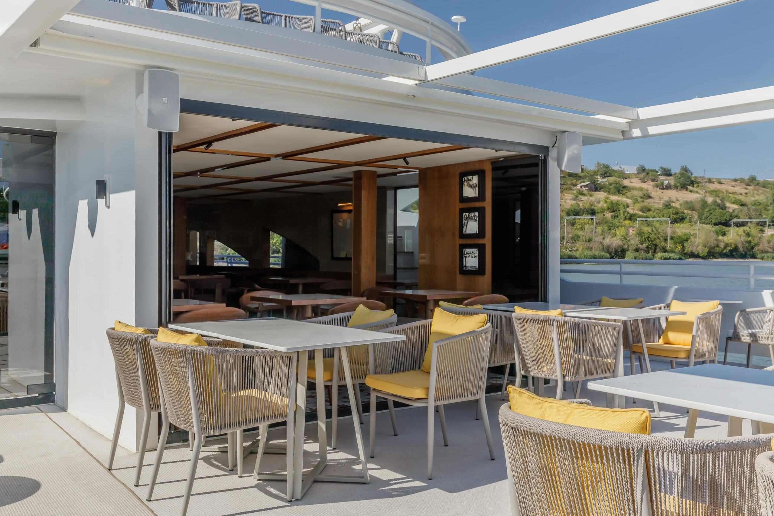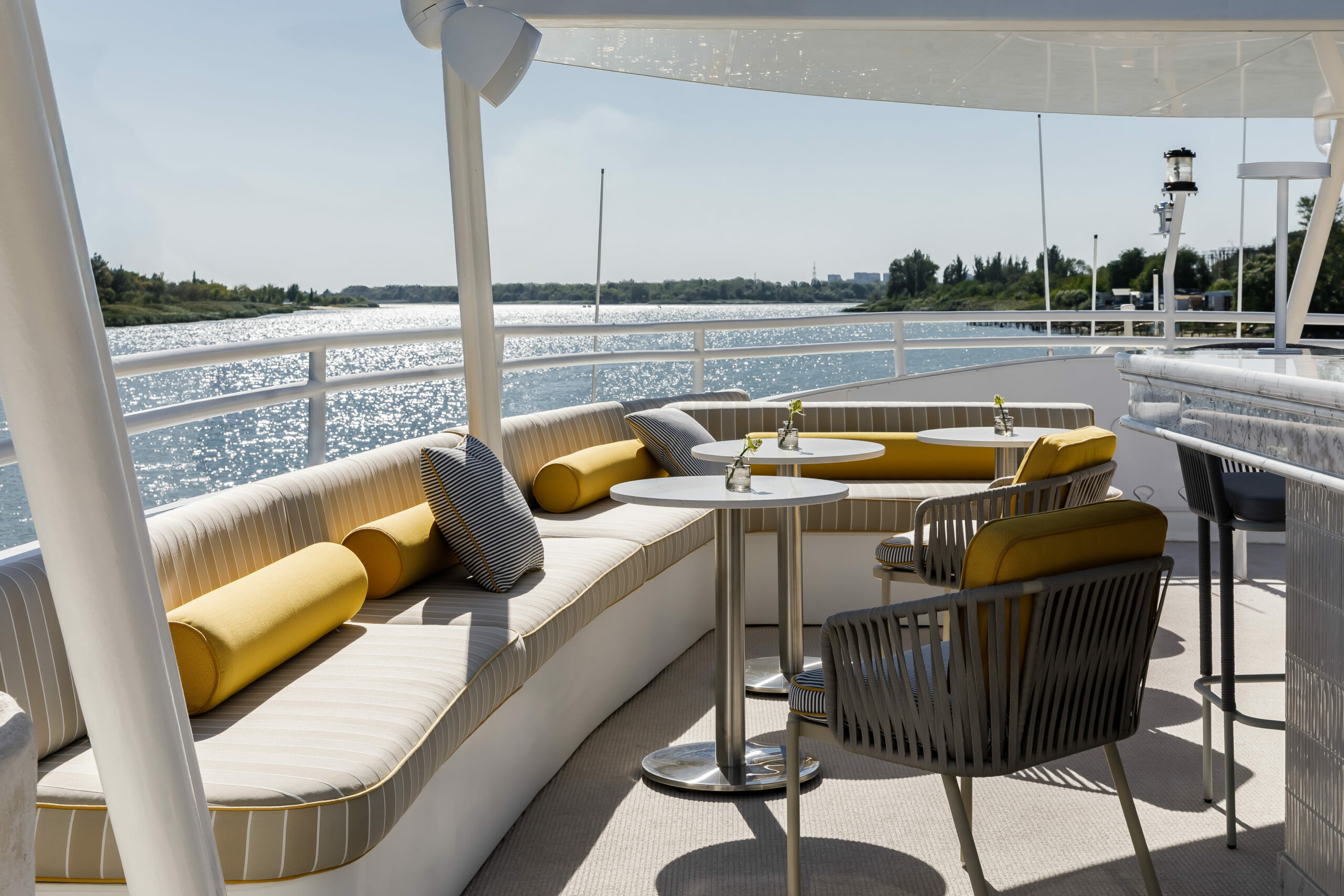 Атмосфера на борту теплохода пленительная – с верхней палубы открывается панорамный вид на огни ночного города, где на свежем воздухе под зажигательные треки диджей устроит дискотеку, а на нижней палубе можно уединиться для душевного и теплого общения.